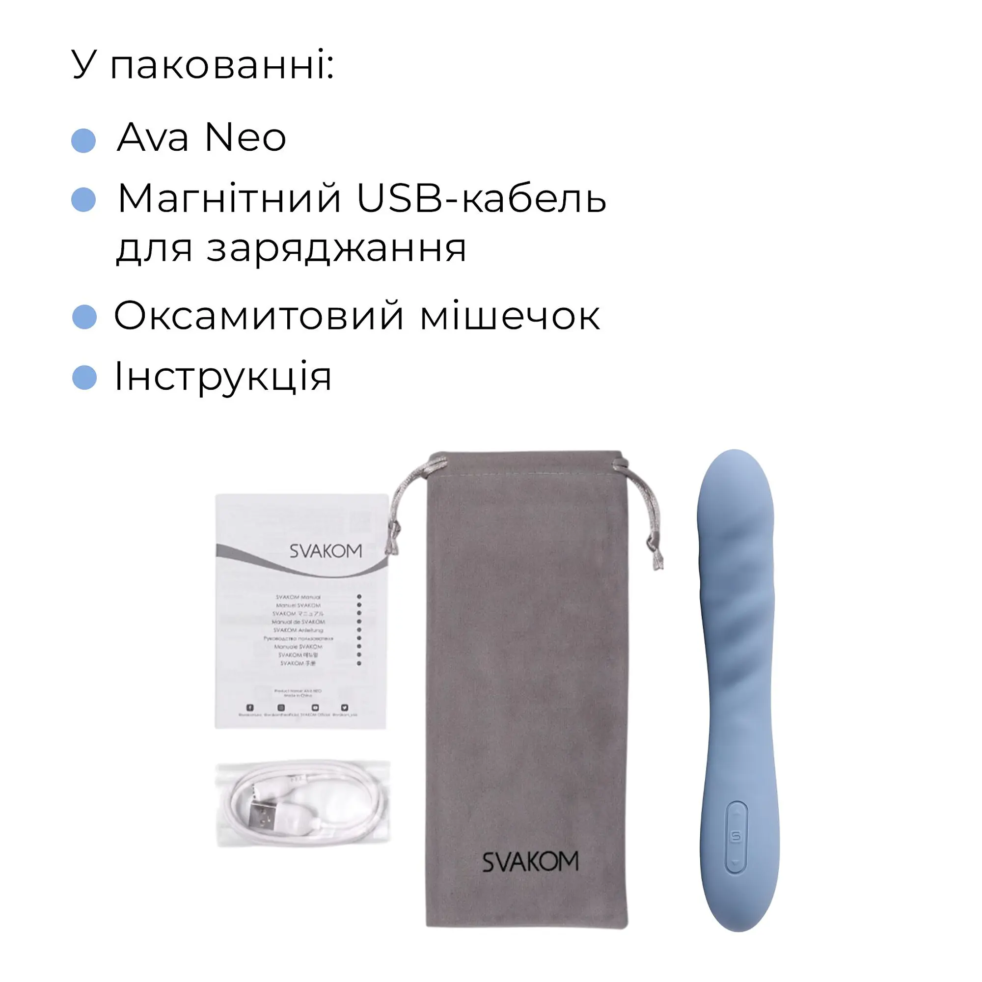 Елегантний, ніжний і надзвичайно потужний! Пропонуємо купити смарт-вібратор з пульсацією Svakom Ava Neo—інноваційну іграшку для глибокої стимуляції точки G. Вібратор покритий фантастичним оксамитовим силіконом та оснащений двома моторами. Ви можете насолоджуватисяпотужною вібрацією, хвилювальною пульсацією або пульсацією та вібрацією одночасно. Є 5 режимів роботи вібромотора, 5 режимів пульсації та 5 режимів одночасної роботи двох моторів. І для кожного режиму ви зможете встановити ту інтенсивність впливу, яка вам подобається (передбачено 5 рівнів)! Svakom Ava Neo створений для безмежного задоволення—насолоджуйтесь ним не тільки в спальні, а й у душі або ванні, адже він повністю водонепроникний. Але і це ще не все! Керувати іграшкою можна через застосунок на смартфоні, у якому відкривається ще більше можливостей.